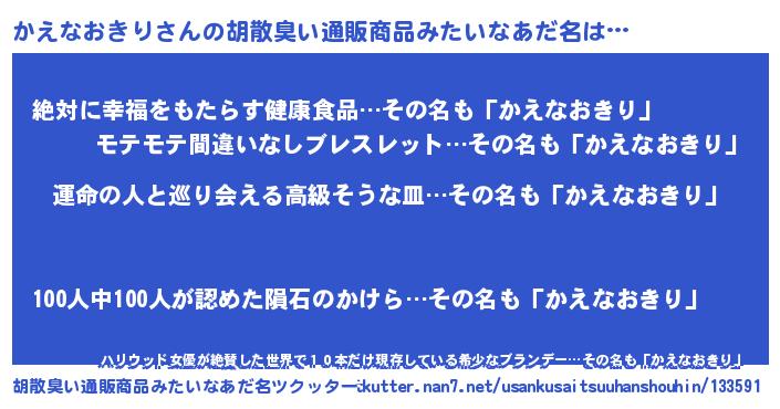 | 男性向けラノベタイトル風あだ名 | 『かえなおきりに滅ぼされるだけの簡単なお仕事です』 |
