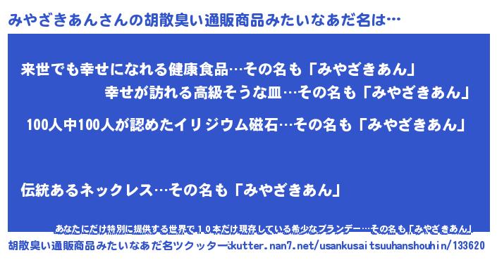 | ヘコむあだ名 | 『みやざきあん(苦笑)』『なまこ酢』 |