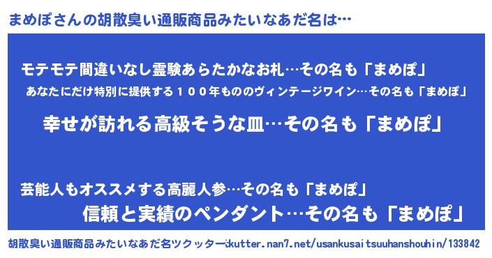 | 男性向けラノベタイトル風あだ名 | 『やはりまめぽの青春ラブコメはまちがっている 』 |