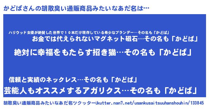 | 意味不明あだ名 | 『永久保存かどば』『自称かどば』 |