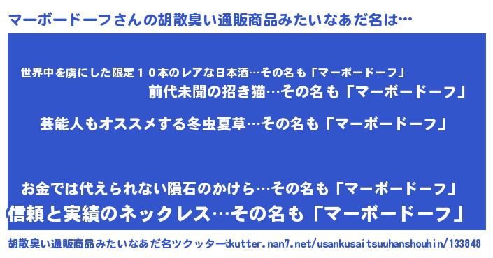 | 男性向けラノベタイトル風あだ名 | 『Re:マーボードーフから始める異世界生活』 |