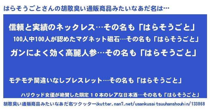 | 男性向けラノベタイトル風あだ名 | 『ハラソウゴトスレイヤー』 |