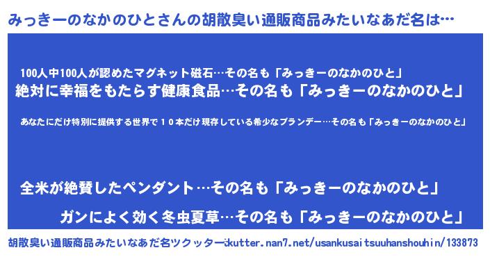 | 意味不明あだ名 | 『住所不定無職みっきーのなかのひと(71歳)』 |