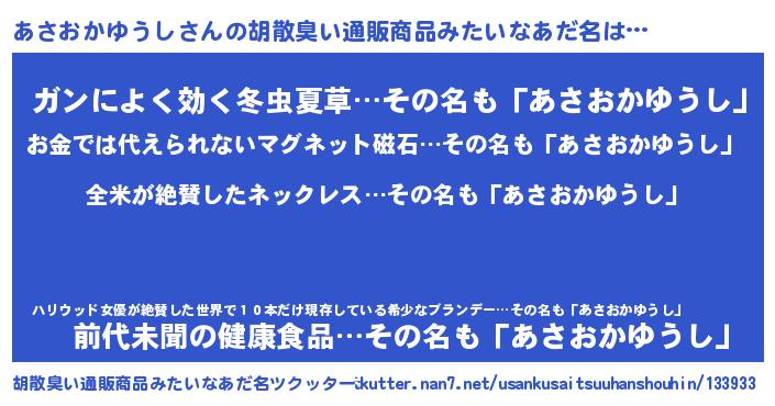 | 男性向けラノベタイトル風あだ名 | 『あさおかゆうしの嫁は女の子じゃないと思った?』 |