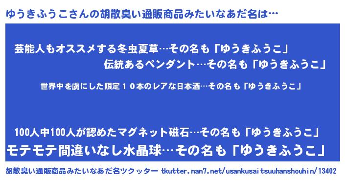 | 意味不明あだ名 | 『住所不定無職ゆうきふうこ(53歳)』 |