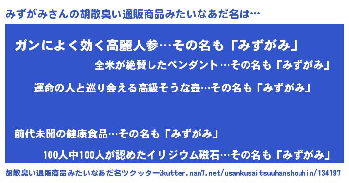 | 男性向けラノベタイトル風あだ名 | 『みずがみ~年齢イコール彼女いない歴の魔法使い~』 |