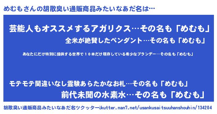 | 意味不明あだ名 | 『住所不定無職めむも(89歳)』『自称めむも』 |