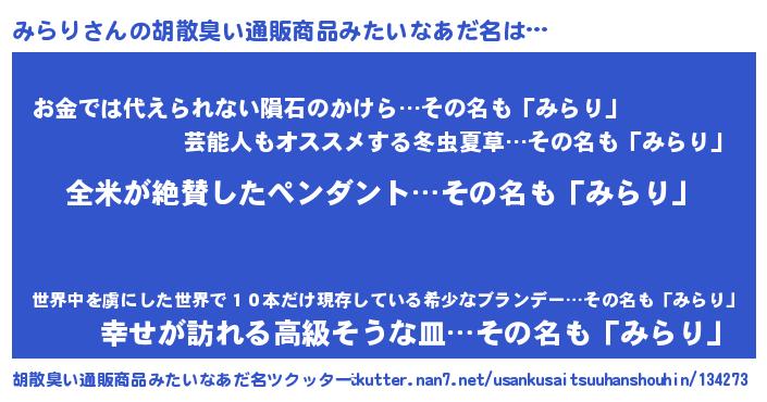 | 意味不明あだ名 | 『とにかく怪しいみらり』『自称みらり』 |