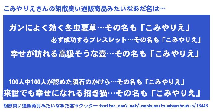 | 肩書あだ名 | 『こみやりえ中尉』『こみやりえ総理大臣』 |