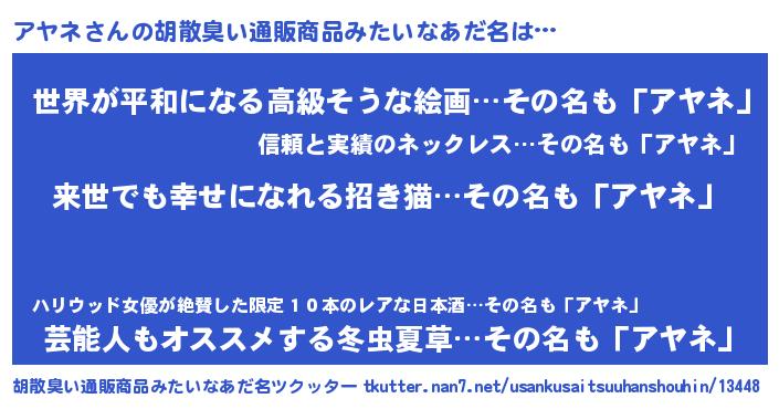 | ヘコむあだ名 | 『アヤネ(小並感)』『牛乳』 |
