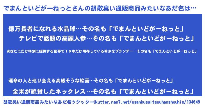 | 男性向けラノベタイトル風あだ名 | 『この素晴らしい世界にでまんといどがーねっとを!』 |