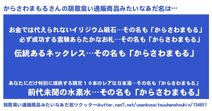 | 男性向けラノベタイトル風あだ名 | 『からさわまもるの嫁は女の子じゃないと思った?』 |