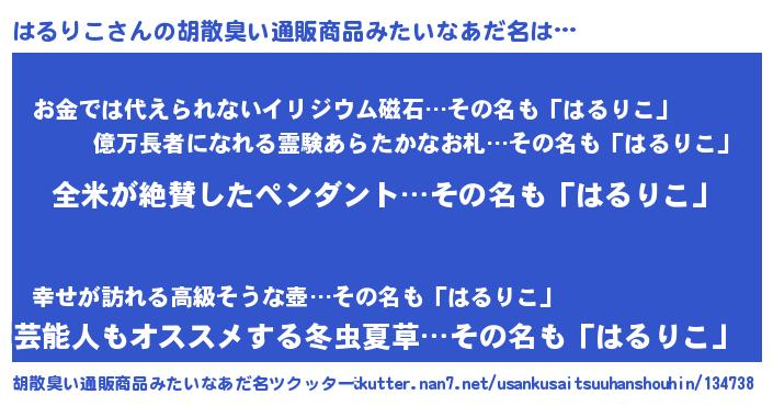 | 男性向けラノベタイトル風あだ名 | 『はるりこ~年齢イコール彼女いない歴の魔法使い~』 |