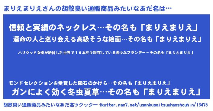 | 意味不明あだ名 | 『住所不定無職まりえまりえ(71歳)』 |
