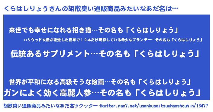 | 意味不明あだ名 | 『とにかく怪しいくらはしりょう』 |