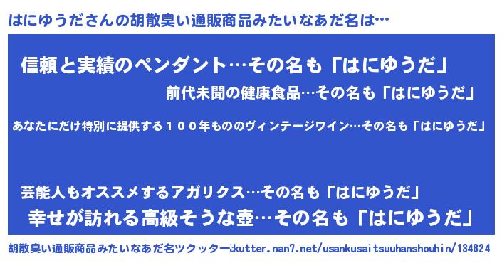 | 意味不明あだ名 | 『住所不定無職はにゆうだ(1歳)』 |