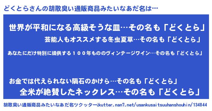| 男性向けラノベタイトル風あだ名 | 『どくとら~年齢イコール彼女いない歴の魔法使い~』 |