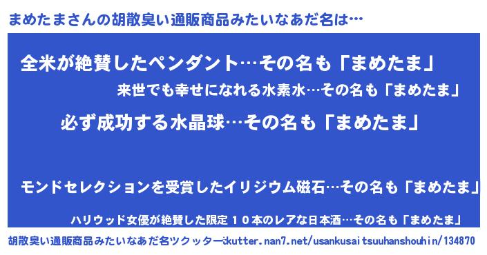 | 男性向けラノベタイトル風あだ名 | 『まめたまの憂鬱』『魔弾の王とまめたま』 |