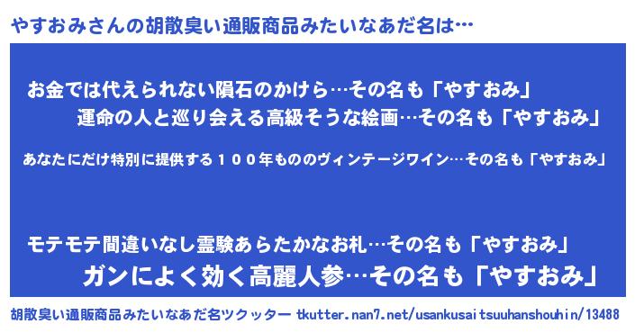 | 意味不明あだ名 | 『住所不定無職やすおみ(2歳)』 |