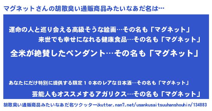| 男性向けラノベタイトル風あだ名 | 『マグネットの嫁は女の子じゃないと思った?』 |