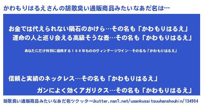 | 意味不明あだ名 | 『住所不定無職かわもりはるえ(2歳)』 |