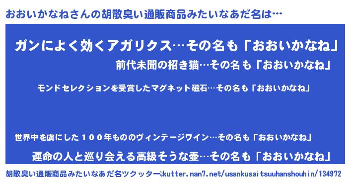 | 男性向けラノベタイトル風あだ名 | 『おおいかなねに滅ぼされるだけの簡単なお仕事です』 |