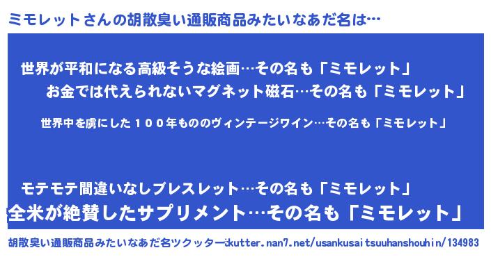 | 意味不明あだ名 | 『住所不定無職ミモレット(7歳)』 |