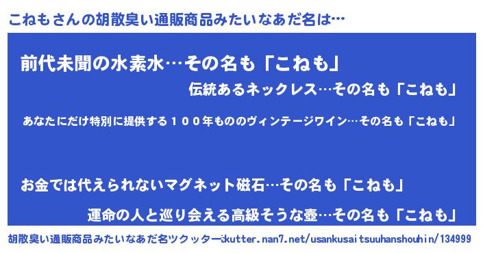 | 男性向けラノベタイトル風あだ名 | 『この素晴らしい世界にこねもを!』 |