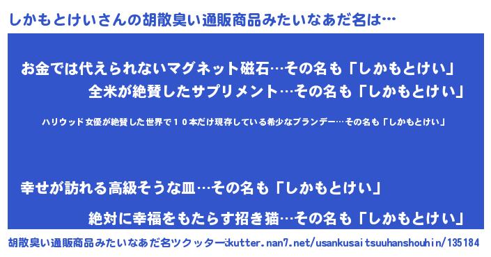 | ヘコむあだ名 | 『しかもとけい(苦笑)』『しかっちょ』 |