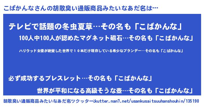 | 意味不明あだ名 | 『住所不定無職こばかんな(71歳)』 |