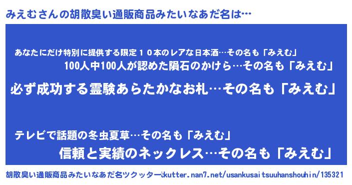 | ヘコむあだ名 | 『みえもー』『みえを』『みえむ(爆)』 |