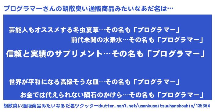 | 男性向けラノベタイトル風あだ名 | 『ダンジョンにプログラマーを求めるのは間違っているだろうか』 |