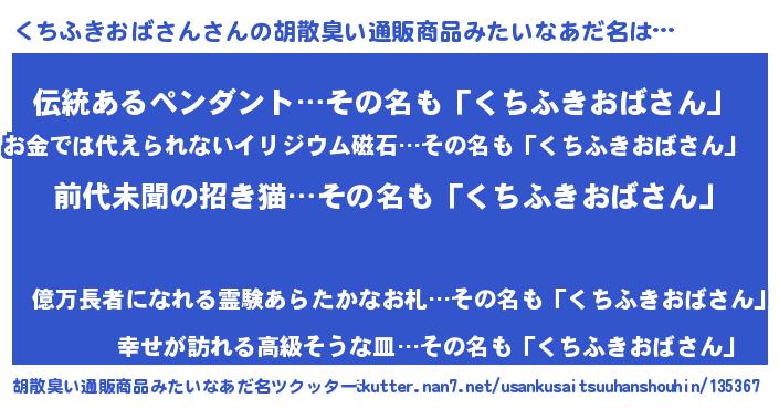 | ヒーロー風カッコイイあだ名 | 『ネオクチフキオバサン』『黄金騎士クチ』 |
