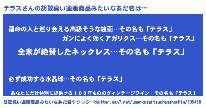 | 男性向けラノベタイトル風あだ名 | 『テラスの嫁は女の子じゃないと思った?』 |