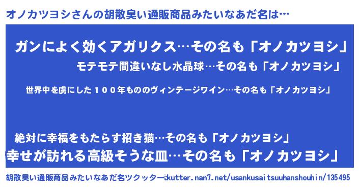 | 女子向けラノベタイトル風あだ名 | 『乙女ゲームの破滅フラグしかない悪役オノカツヨシに転生してしまった…』 |