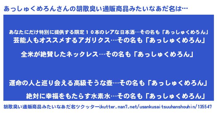 | ヘコむあだ名 | 『あっっぺ』『あっしゅくめろん(苦笑)』 |