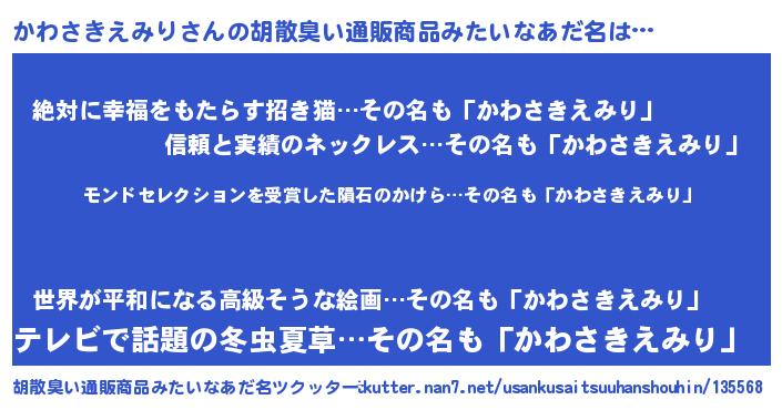 | ヘコむあだ名 | 『かわさきえみり(震え声)』『かわを』 |