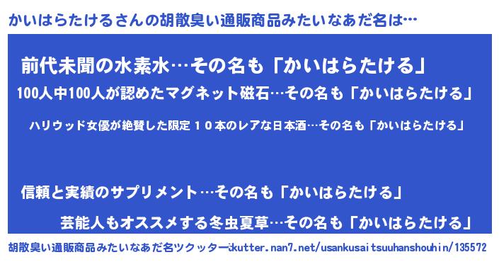 | 恥ずかしいあだ名 | 『かいちん』『カイハラタケルデラックス』 |