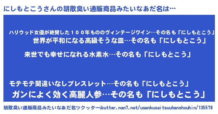 | 男性向けラノベタイトル風あだ名 | 『にしもとこうという概念が存在しない退屈な世界 』 |