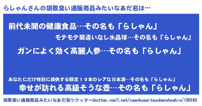 | 意味不明あだ名 | 『自称らしゃん』『永久保存らしゃん』 |