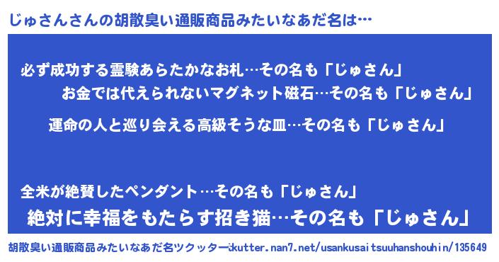 | 男性向けラノベタイトル風あだ名 | 『じゅさん~年齢イコール彼女いない歴の魔法使い~』 |