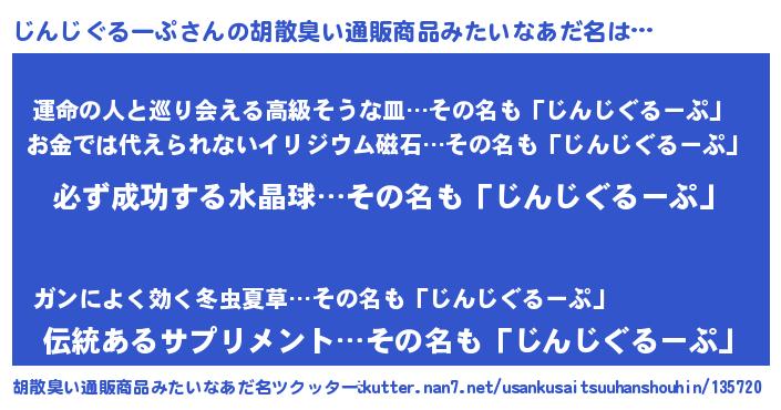 | 男性向けラノベタイトル風あだ名 | 『じんじぐるーぷの憂鬱』 |