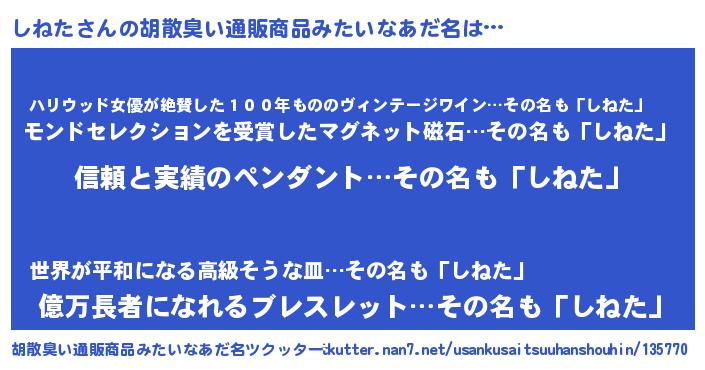 | 意味不明あだ名 | 『とにかく怪しいしねた』 |