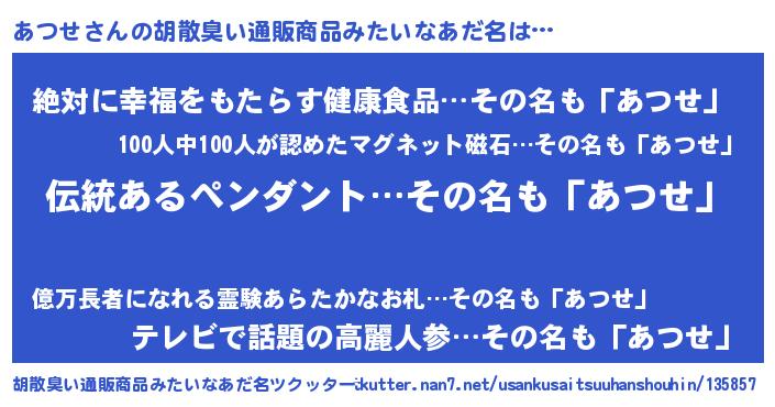 | 意味不明あだ名 | 『とにかく怪しいあつせ』『自称あつせ』 |