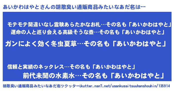 | ヘコむあだ名 | 『あいもー』『あいかわはやと(苦笑)』 |