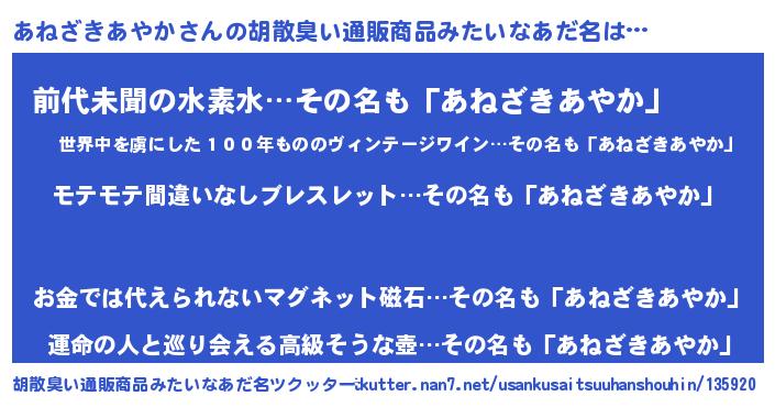 | ヘコむあだ名 | 『あねふぇ~』『あねざきあやか(遠い目)』 |