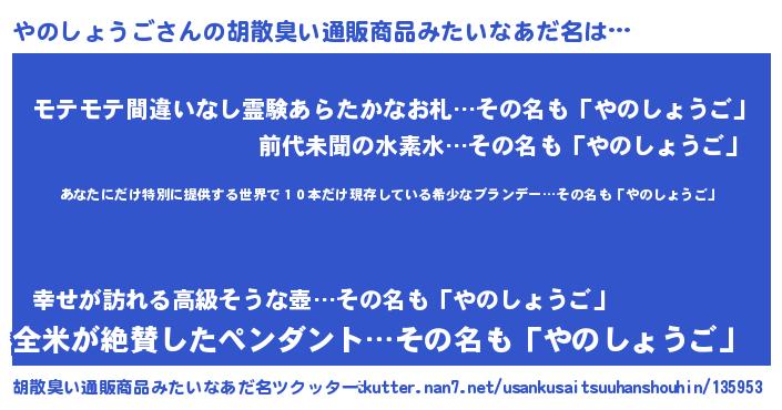 | 男性向けラノベタイトル風あだ名 | 『この素晴らしい世界にやのしょうごを!』 |