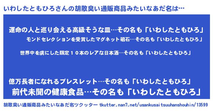 | 意味不明あだ名 | 『住所不定無職いわしたともひろ(40歳)』 |
