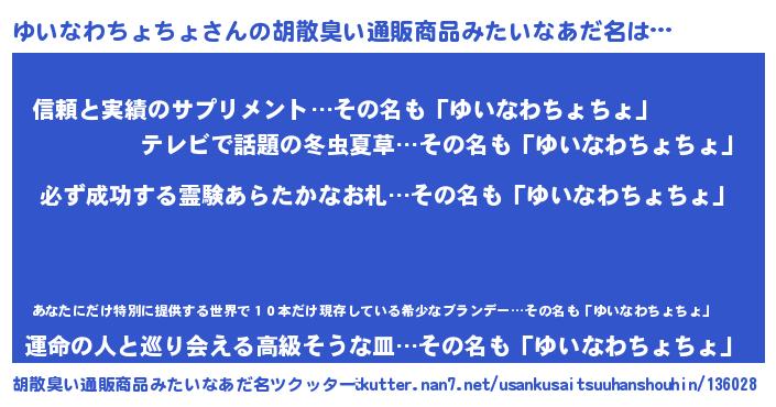 | 男性向けラノベタイトル風あだ名 | 『ゆいなわちょちょの憂鬱』 |