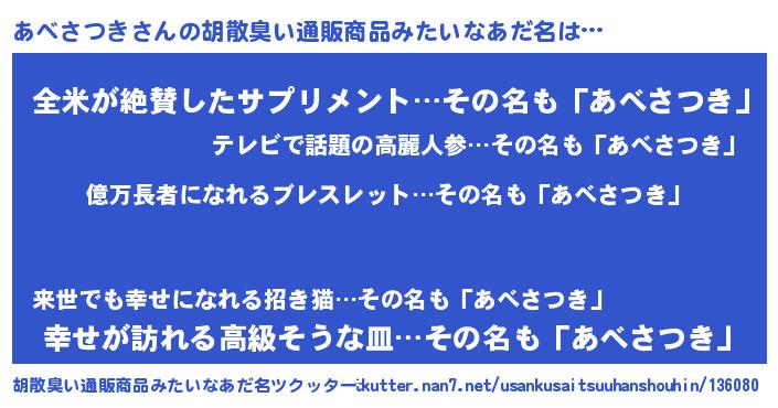 | 男性向けラノベタイトル風あだ名 | 『アベサツキアートオンライン』 |